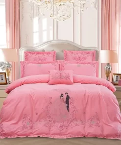 Korean-Style Cotton Lace Jacquard Wedding Four-Piece Set with Princess Pink Jade-Colored Duvet Cover
